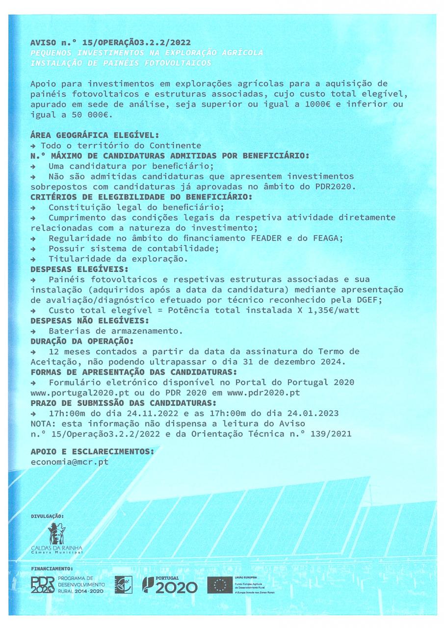 APOIO PARA INVESTIMENTOS EM EXPLORAÇÕES AGRÍCOLAS PARA A AQUISIÇÃO DE PAINÉIS FOTOVOLTAICOS